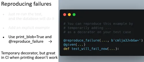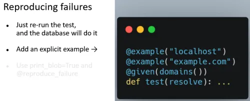 Often, you don’t even need assertions in the test. Generating unusual input data is surprisingly effective. It can give you the sort of feedback you could get from real users, but you don’t need to ship before getting the feedback. A common concern is that, if you have randomized testing, then are things flaky? How do you deal with determinism? Hypothesis has been working on that for years, so they have solid answers to these kinds of questions: