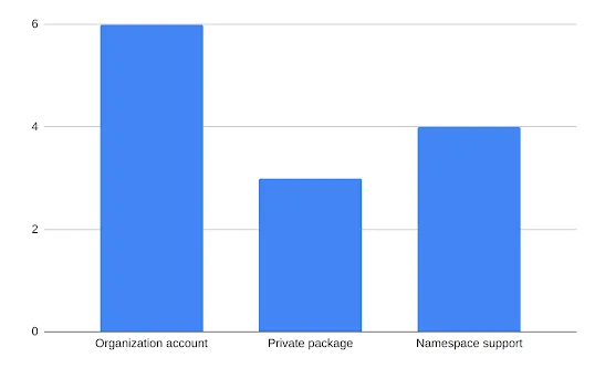 From the second survey, it was clear that features like organization accounts and namespace support would be most useful to users in a team. This team could represent an organization or community project. To confirm this finding, we held another poll asking users to choose between the three features- organization/team accounts, namespace support and private packages.