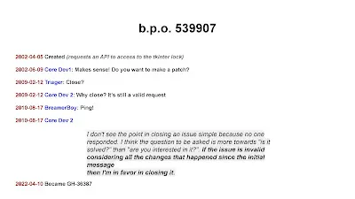 If the proposed tkinter lock from BPO-539907 is ever implemented, Katriel, argues, “it’s not because of the twenty-year-old issue – it’s because somebody will discover the need for it.” Rather than only closing issues that have obvious defects, we should flip the script, and become far more willing to close issues if they serve no obvious purpose. Issues should only be kept open if they serve an obvious purpose in helping further CPython’s development. Instead of asking “Why should we close this?”, we should instead ask, “Why should we keep this open?”